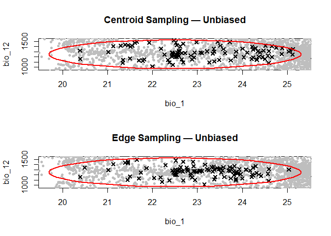 The centroid strategy concentrates records near the niche center, while the edge strategy spreads records toward the ellipsoid boundary. Both are plotted against the environmental background to illustrate the difference in spatial distribution within E-space, black crosses (×) are the sampled occurrences, grey points are the background, and the red ellipse is the niche boundary.