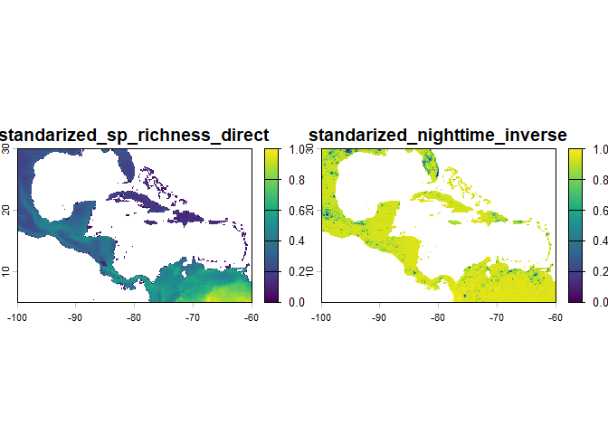 Bias layers represent external factors that influence sampling detectability or effort, independent of the species’ actual niche. Each layer is assigned a direction: "direct" means higher values increase sampling probability (e.g., higher species richness → most likely good habitat), while "inverse" means higher values decrease it (e.g., higher light pollution → more urbanization → less likely to have good habitat).