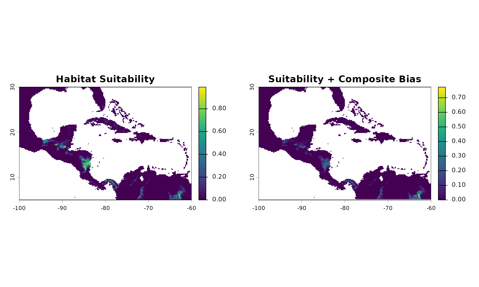 prepare_bias(): Standardizing raw environmental or anthropogenic covariates into probability-scaling surfaces.apply_bias(): Mathematically fusing those bias surfaces with your habitat suitability predictions.